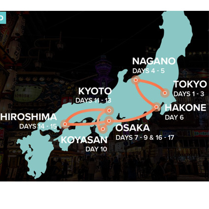 In 13 Tagen besuchst du Tokyo, Nagano, Hakone, Osaka, Koyasan und Kyoto. Du lernst, wie man Sushi rollt, schwingst ein Schwert wie ein Samurai, verliebst dich in märchenhafte Schlösser und verbringst eine Nacht in einem über 1000 Jahre alten buddhistischen Tempel – in der Gesellschaft von Mönchen.