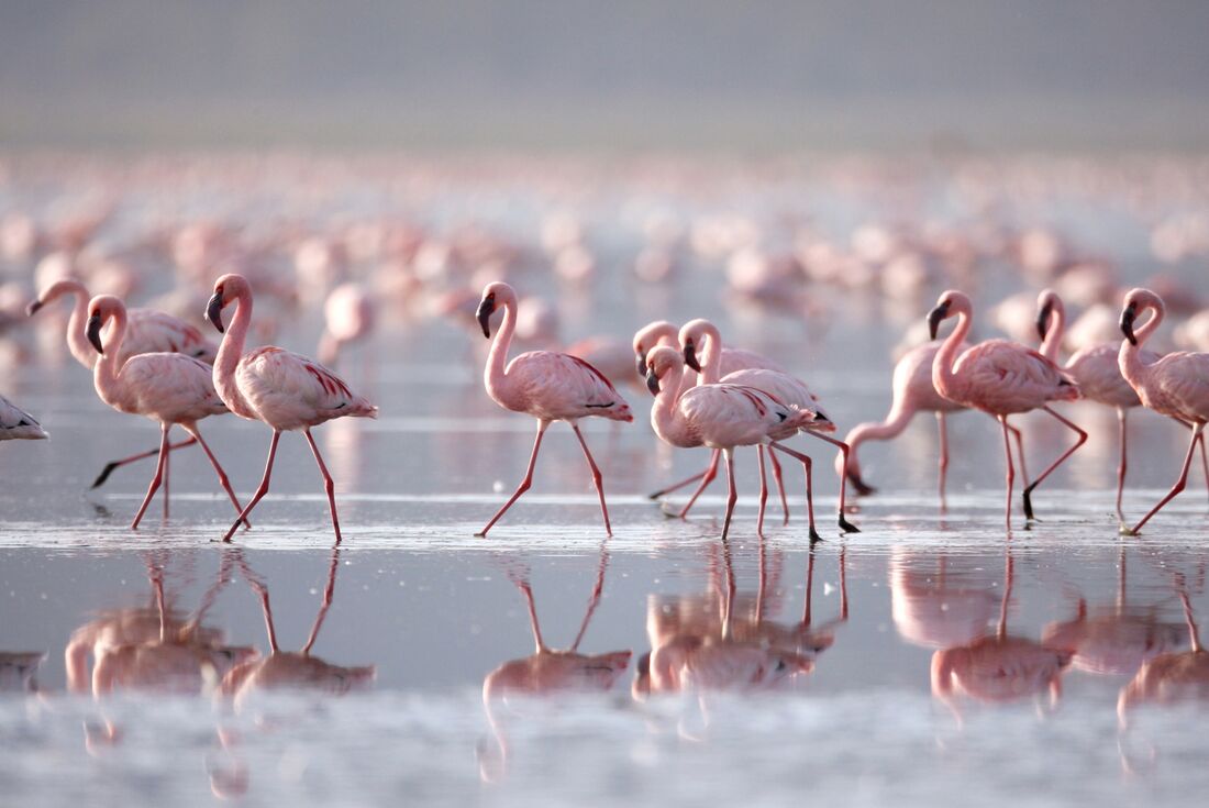 Am Nakurusee tummeln sich nicht nur unzählige, pinke Flamingos, der umliegende Nakuru Nationalpark beheimatet auch Großwild wie Nashörner, Giraffen und Antilopen.