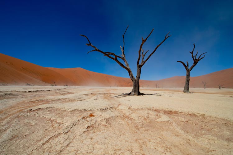 Am nächsten Tag besuchen wir den Namib-Naukluft-Nationalpark, um die erstaunlichen Landschaften von Sossusvlei und Deadvlei zu erleben. Die Vleis sind Lehmpfannen, die durch die gelegentlichen Überschwemmungen des Tsauchab-Flusses entstanden sind. Im Sossusvlei stehen uralte Kameldornbäume (Acacia Erioloba), während sich die Bäume im Deadvlei leblos und kahl von den umliegenden hohen orangefarbenen Sanddünen abheben. (1x F, 2x A)