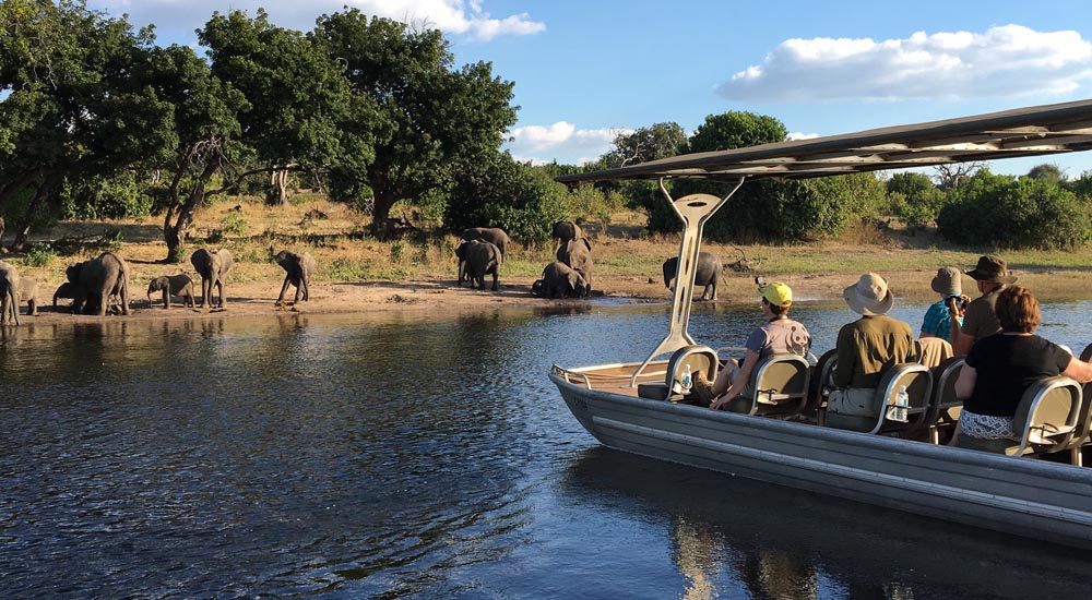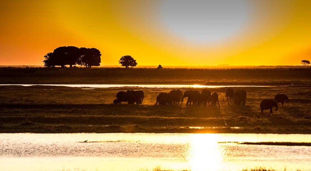 In östlicher Richtung durchqueren wir den Caprivi und erreichen Botswana an der Ngoma Grenze. Wir fahren durch den Chobe Nationalpark zur kleinen Stadt Kasane. Der Chobe Fluss lockt eine Fülle von Wildtieren an. Unsere Nachmittagsaktivität ist ein unglaubliches Erlebnis auf dem Chobe Fluss, wo wir mit einem Boot in den Park fahren und den Elefanten beim Löschen ihres Durstes ganz nahekommen. Wir verlassen den Park, wenn die goldene Sonne hinter dem Horizont verschwindet. (1x F)