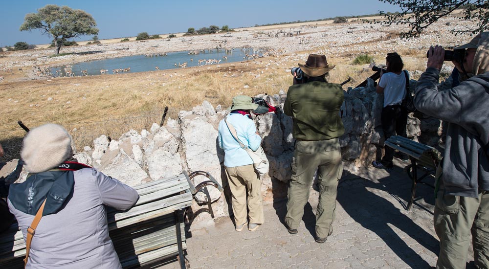 Elefanten, die mit dem weißen Salzstaub aus der Pfanne bedeckt sind, bieten ein außergewöhnliches Fotomotiv. Unser Camp befindet sich am Rande eines beleuchteten Wasserlochs, das uns einen Blick auf die nachtaktiven Tiere ermöglicht, die zum Trinken kommen. Darunter das seltene Spitzmaulnashorn, der Löwe und möglicherweise der Leopard. Am Abend sitzen wir voller Erwartung am Wasserloch. (2x F)