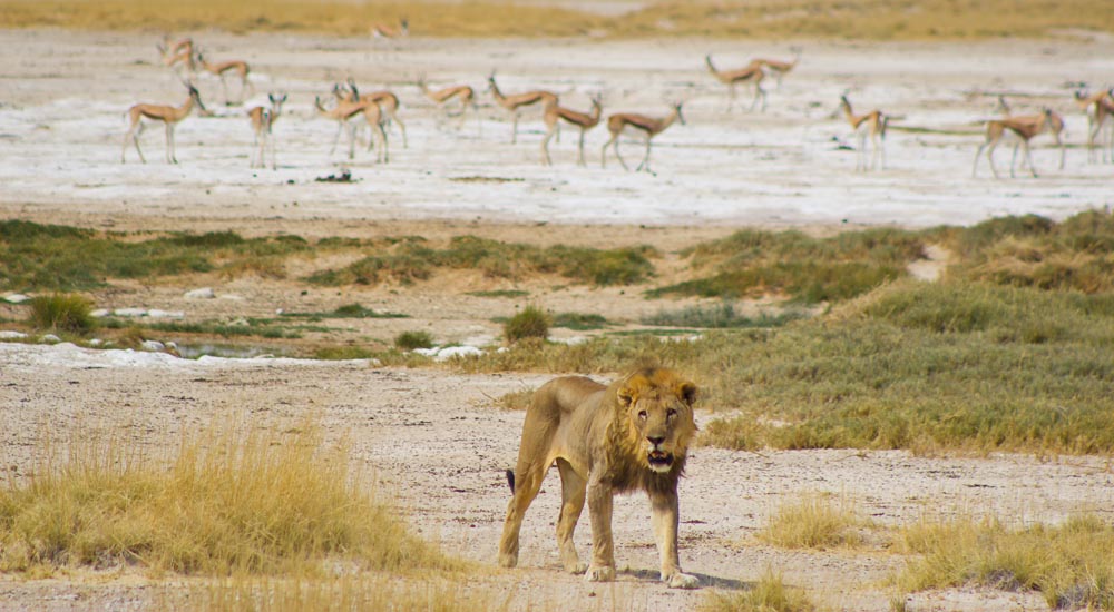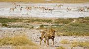 Die Salzpfanne im Etosha ist das Überbleibsel eines großen Sees, der vor Tausenden von Jahren ausgetrocknet ist. Dieser " Große Weiße Ort" ist 120 km breit und bildet die zentrale Attraktion des Nationalparks. Natürliche Quellen und Wasserlöcher an den Rändern des Sees liefern lebenswichtiges Wasser, das die Tierwelt in diesem ansonsten trockenen Gebiet versorgt.